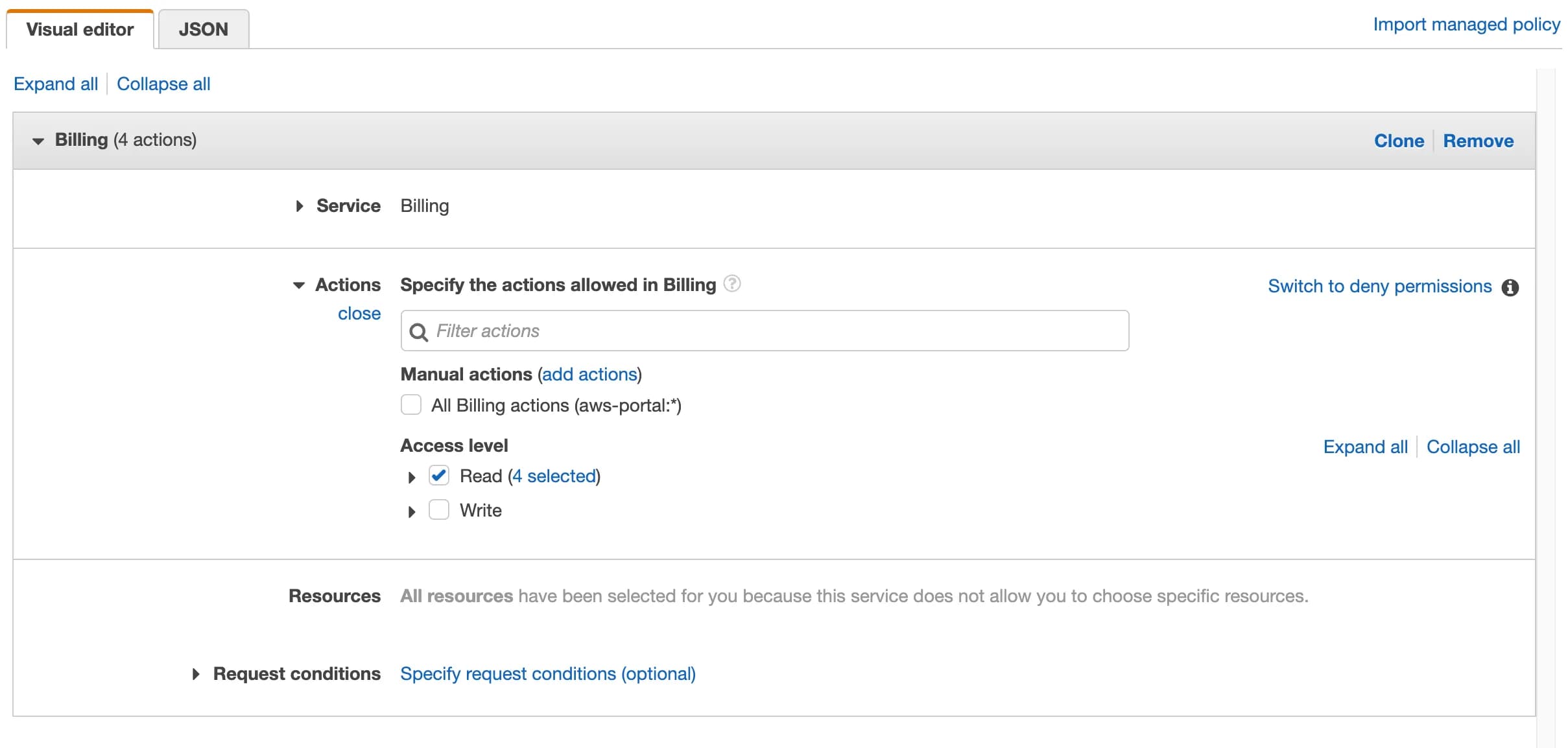 On the Visual editor select the service “Billing” and then choose the Access Level you want to give to the user (All billing actions, Read or Write) in the Action section